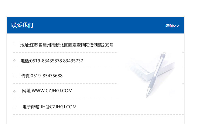 地址:常州市新北區友邦商務大廈1幢16、17層  電話:0519-85101652  傳真:0519-85112595  郵編:213022  網址:www_cz-jiayue_cn.sinon-fk.com  郵箱:xiajifengaa@163.com